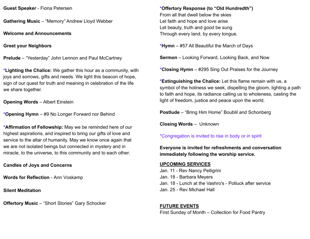 KUUF Sunday Service-Looking Forward, Looking Back, and Now January 4, 2026 at 11:00 am Fiona Petersen